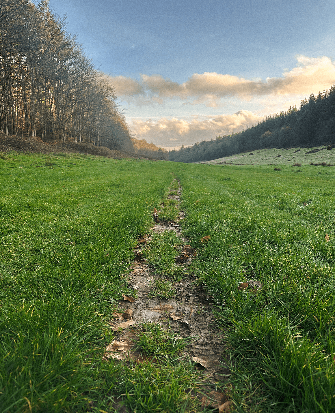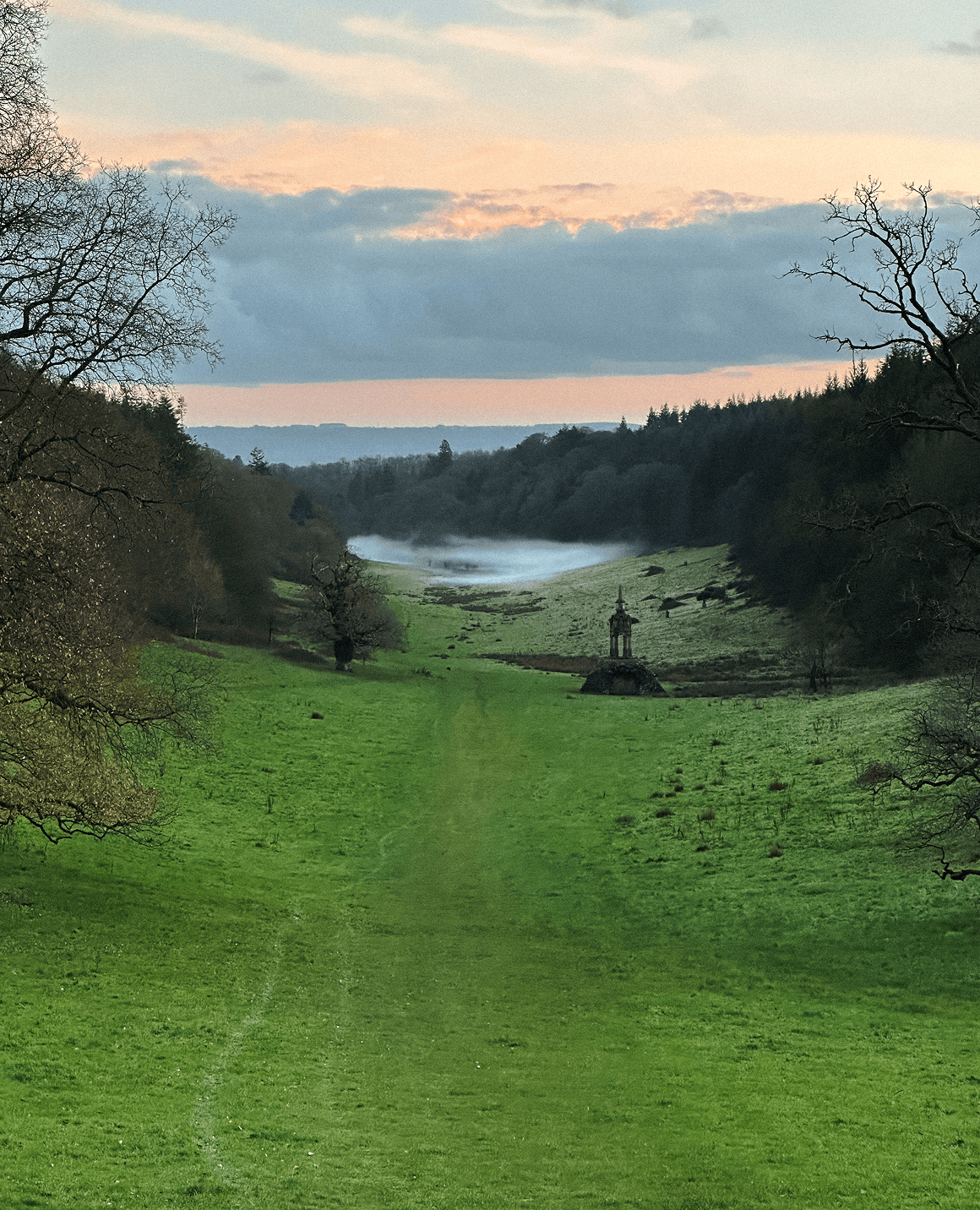 The long, straight ride runs high above Six Wells Valley, skirting its edge with glimpses down into the trees. It is easy to imagine a carriage rolling through here, the landscape designed to reveal itself in stages.