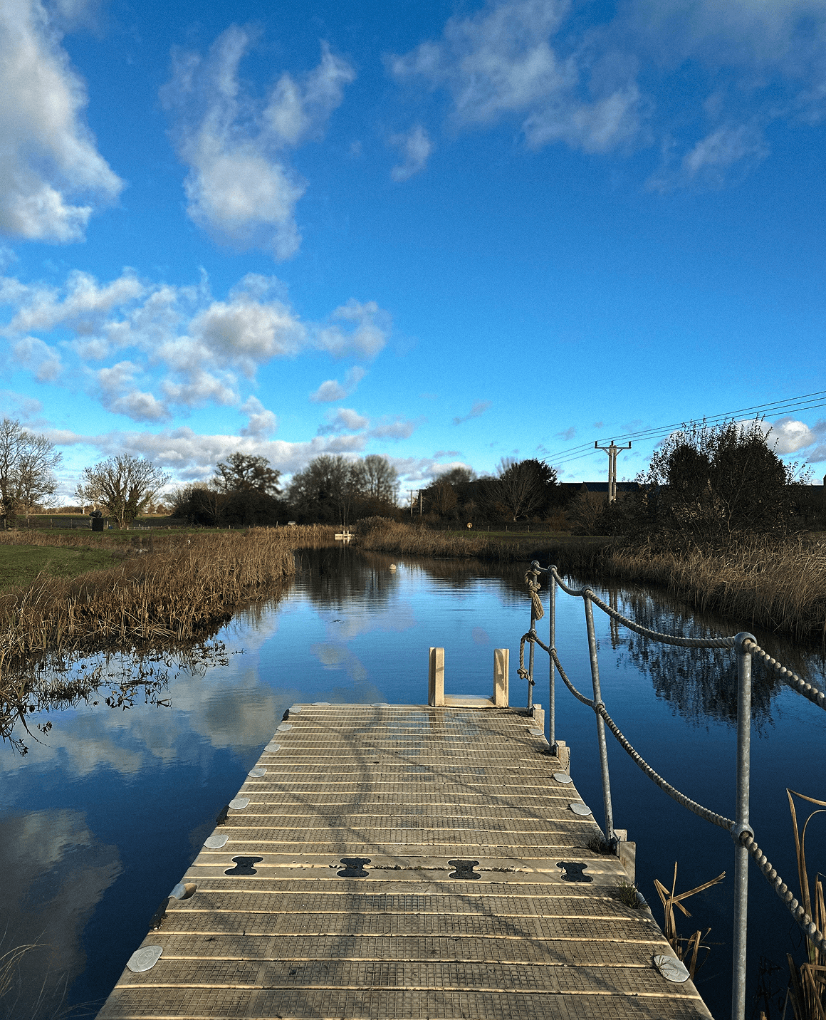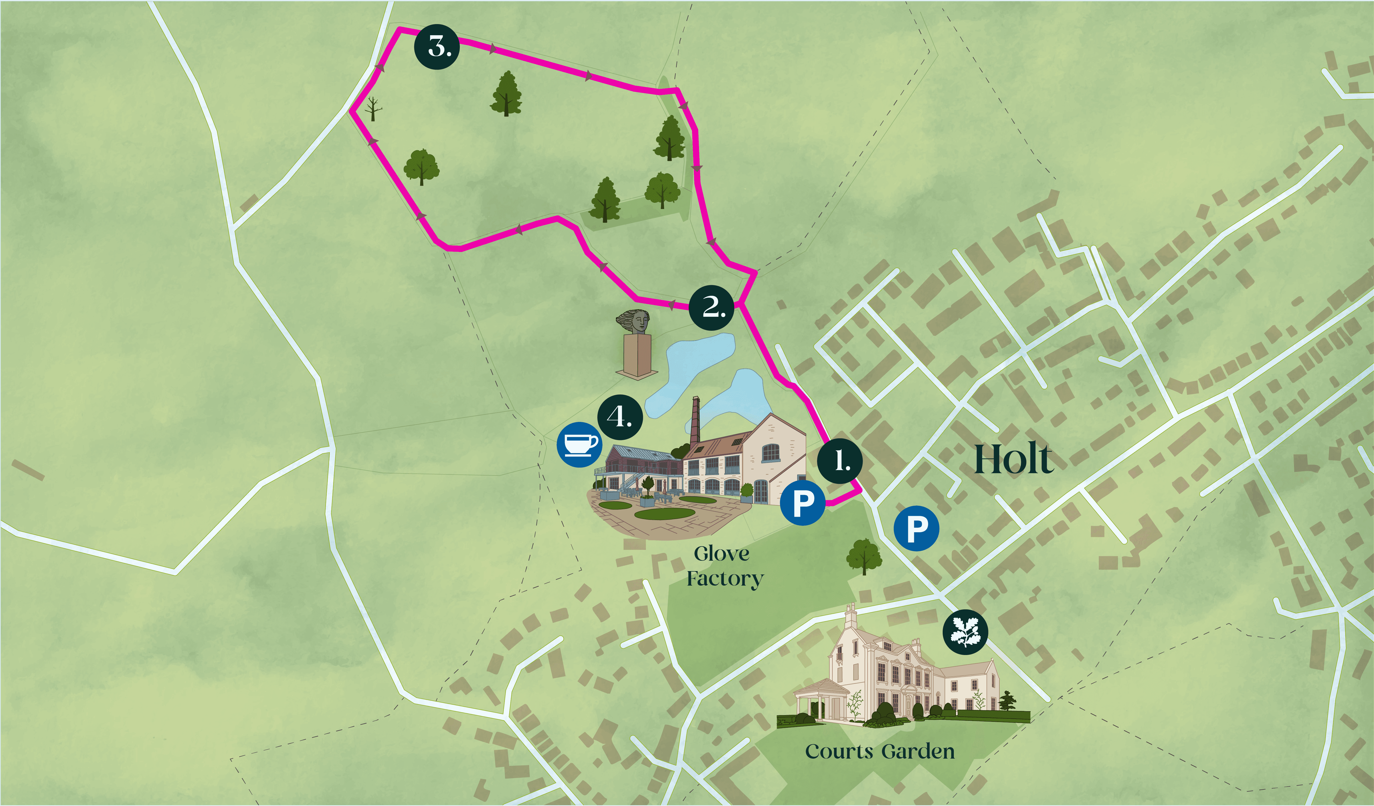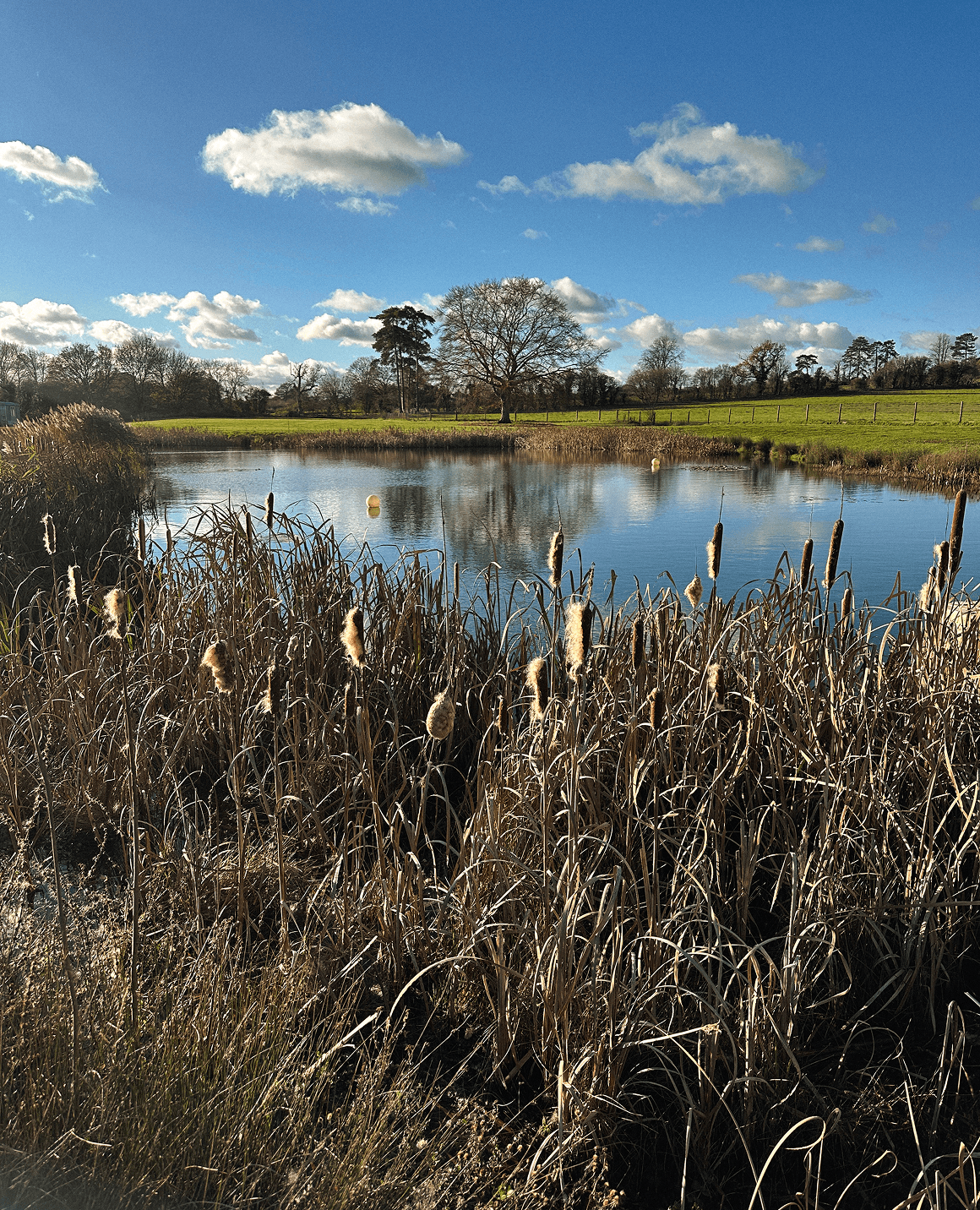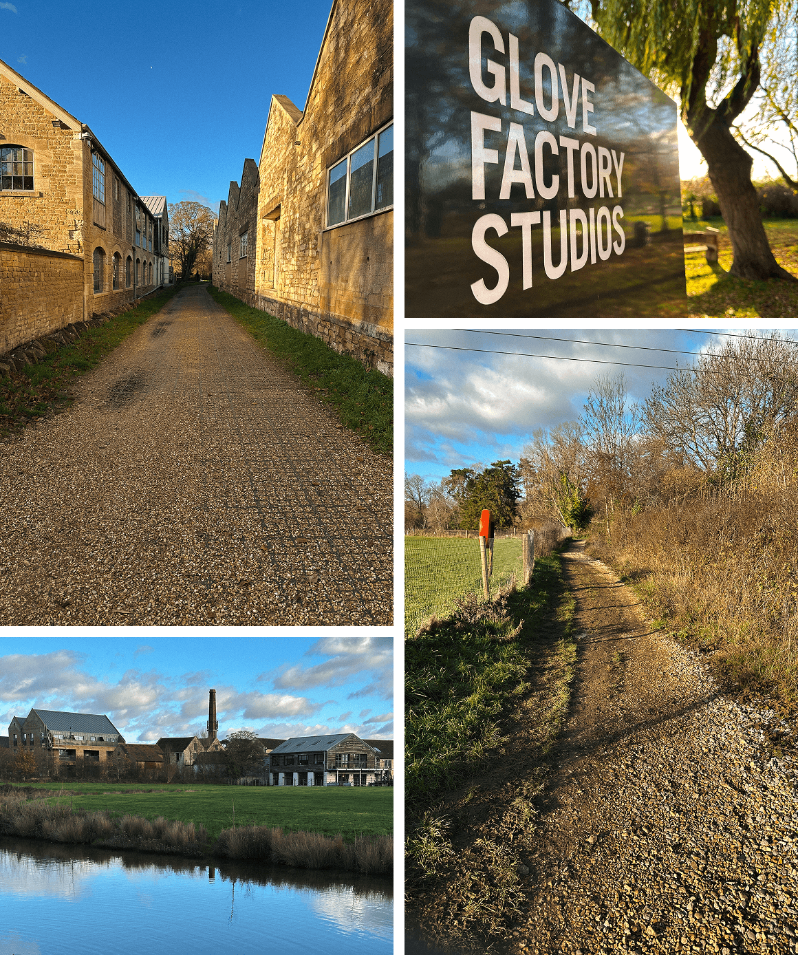Begin at the Glove Factory entrance and follow Brook Lane between the old factory buildings. The lane soon shifts into a track. Look for the public footpath on your left. This runs along the edge of the Glove Factory’s parkland and lakes where reed beds, still water and big skies create a calm, open feel.