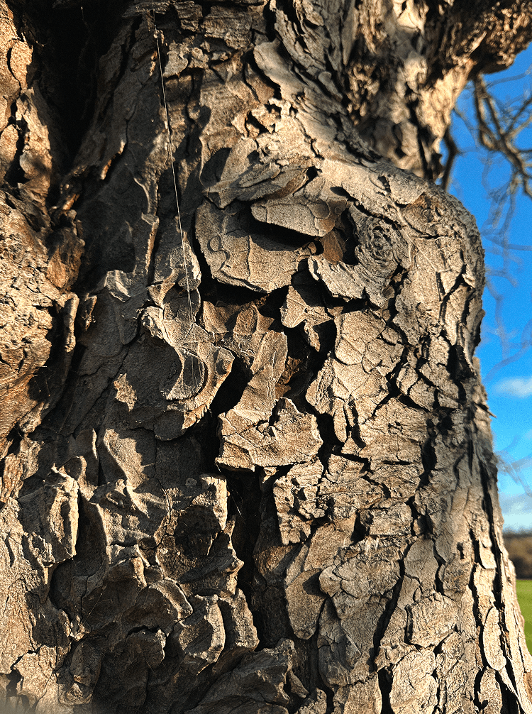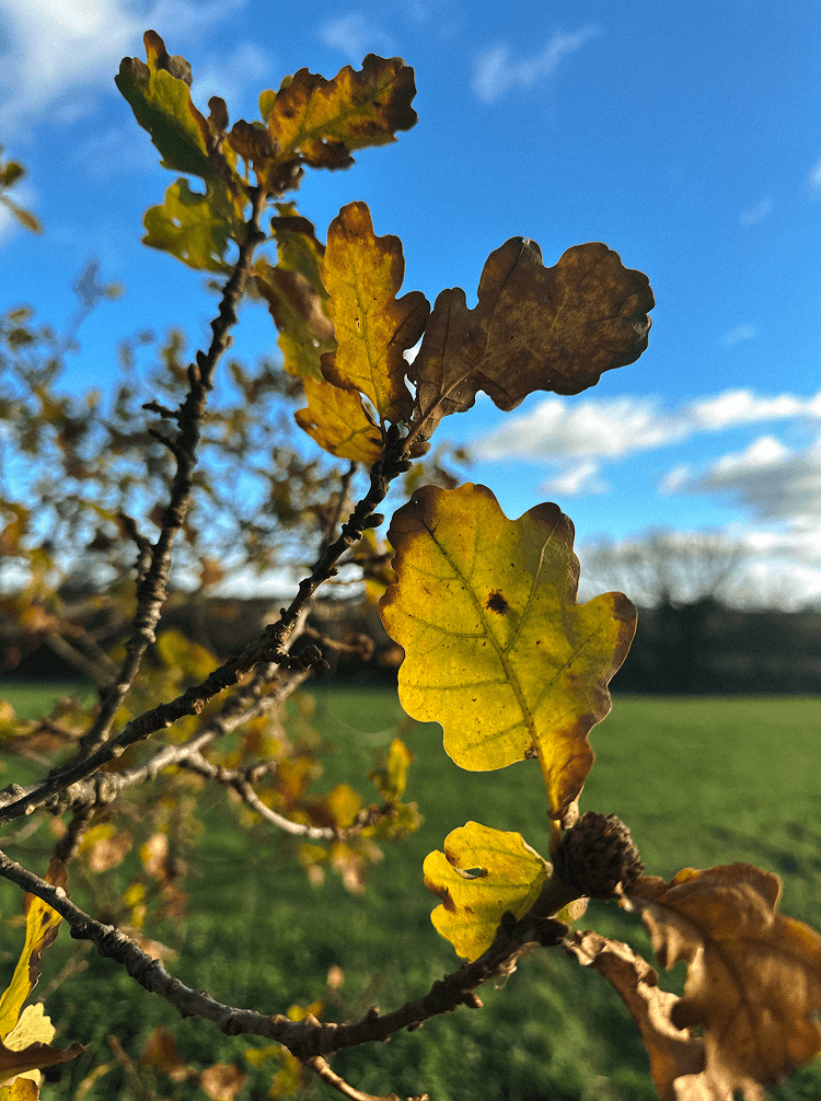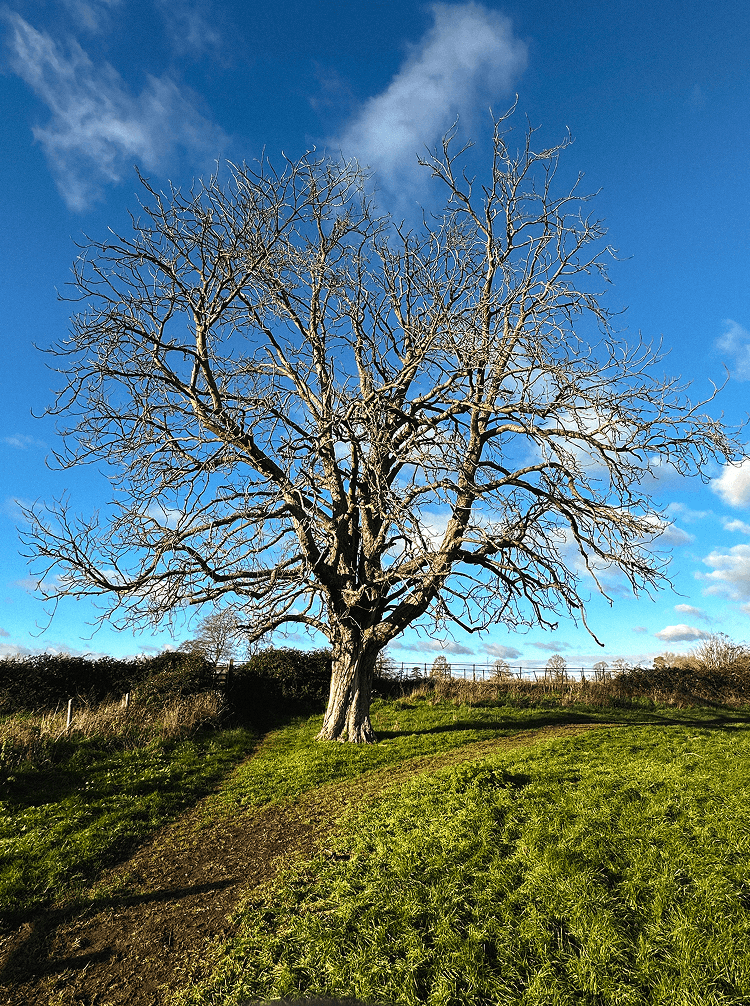 At the top corner, cross a wooden stile and pass through a gate into a much larger field. Head straight on and keep to the field edge. You will pass an oak tree before reaching the top corner marked by an old dead oak. Turn right here and walk along the upper edge of the field.