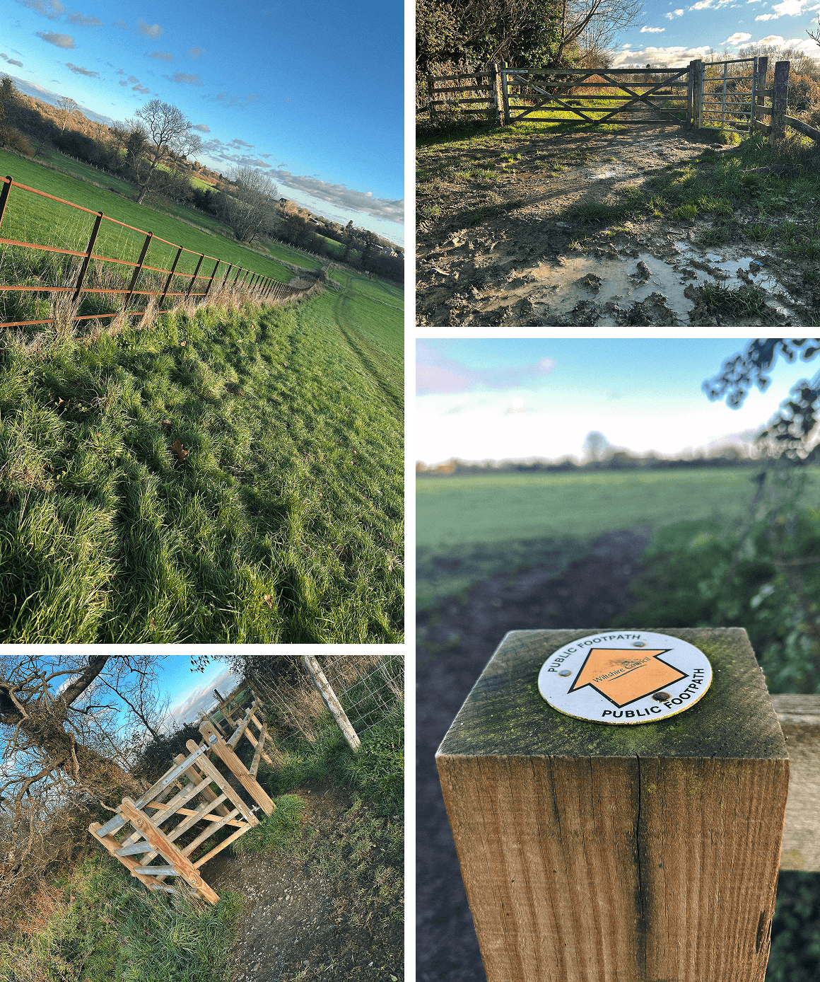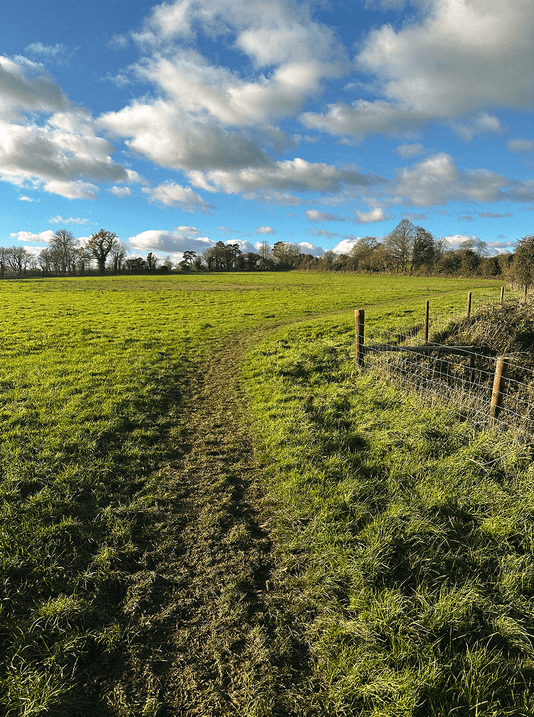 For this short circular walk, take the left fork and pass through a small metal gate into an open field. Follow the path as it traces the outer edge of the field, climbing gently.