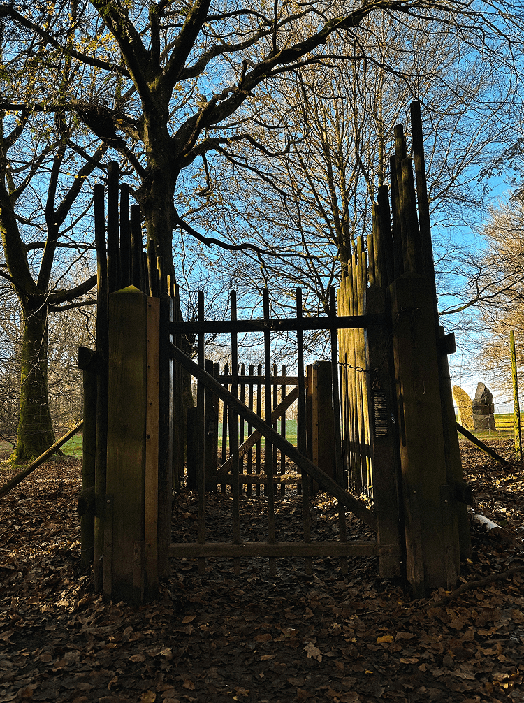 Leaving the trees, you pass through a double wooden fence and enter open ground at the top of Prospect Hill. Here you find nine large standing stones and a ring shaped gateway sculpture made from thirteen smaller stones.