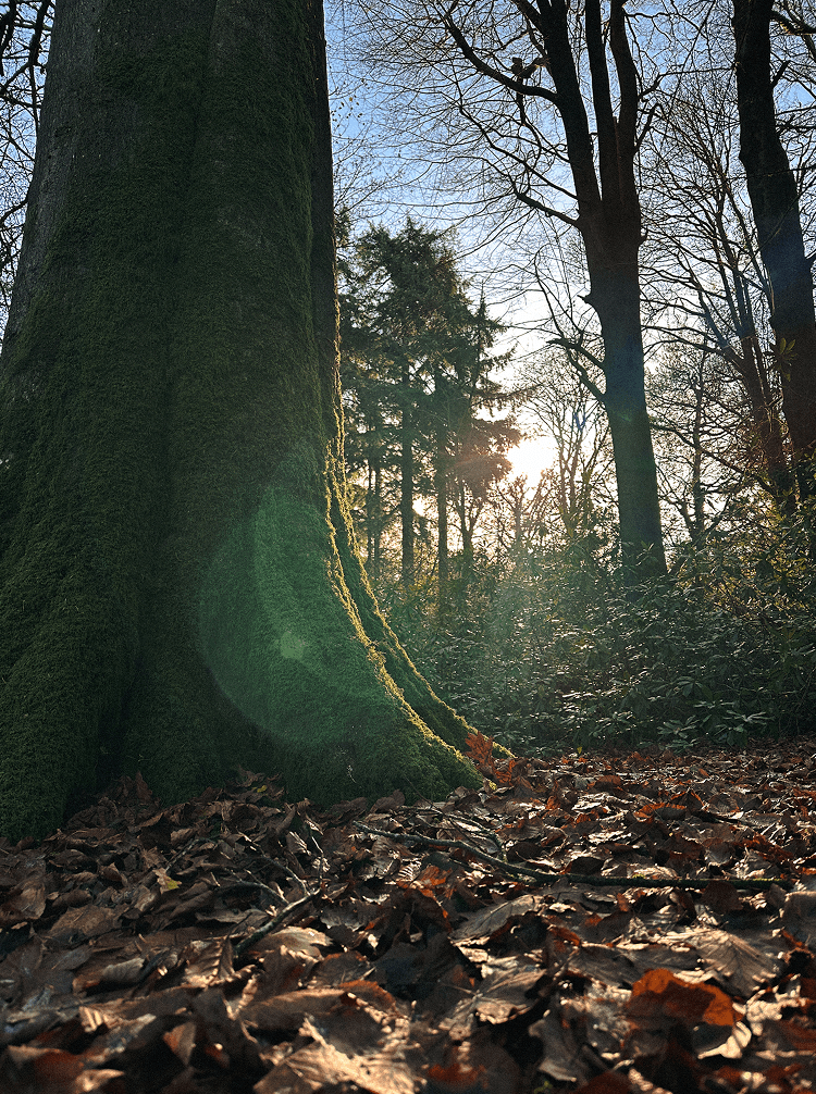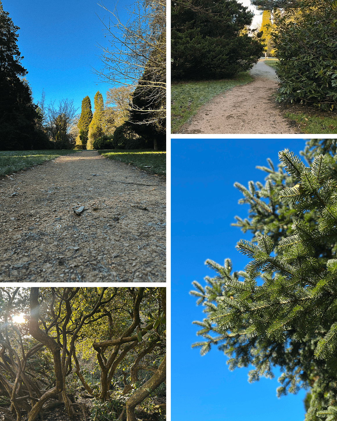 The path meanders through lawns dotted with ornamental planting and tall specimen trees. Rhododendrons, evergreens and pockets of undergrowth create plenty of hiding places for children to explore. It is the sort of woodland that feels curated without being fussy.