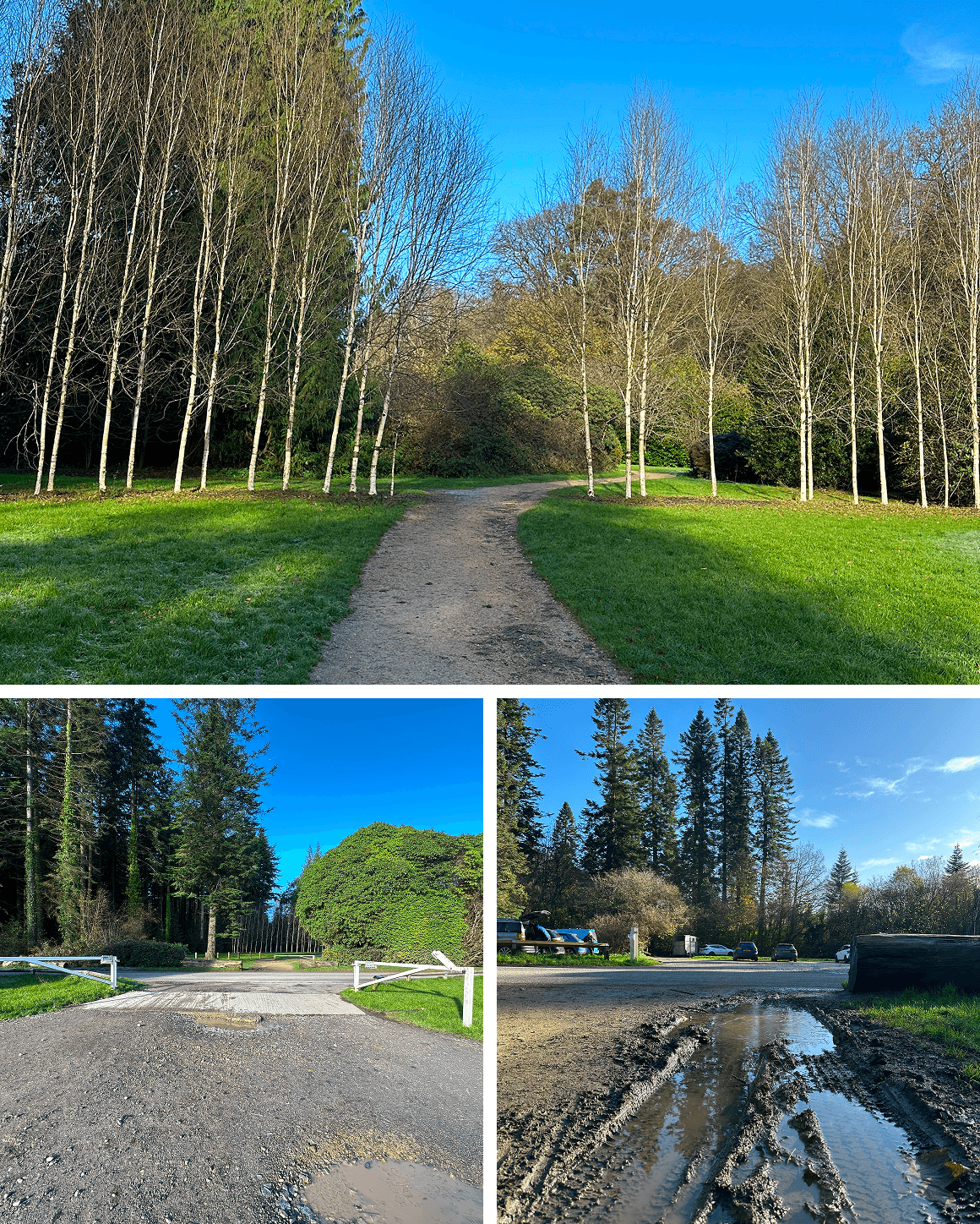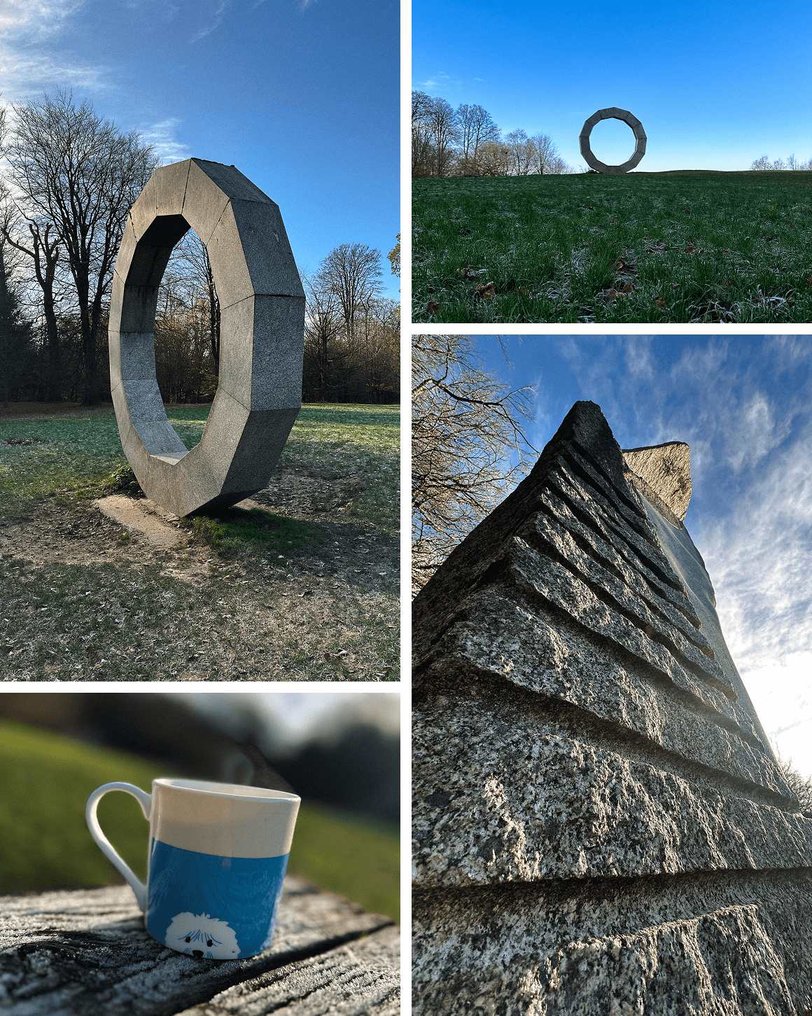 When you are ready to head back, turn left and pass through a different wooden gate beside the stone circle sculpture. This path leads you back into the forest on a different route. Follow the track through the trees until it rejoins the silver birch entrance near the car park.