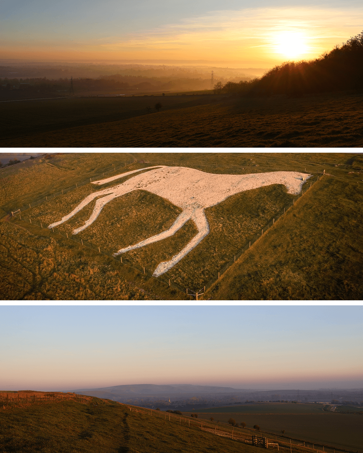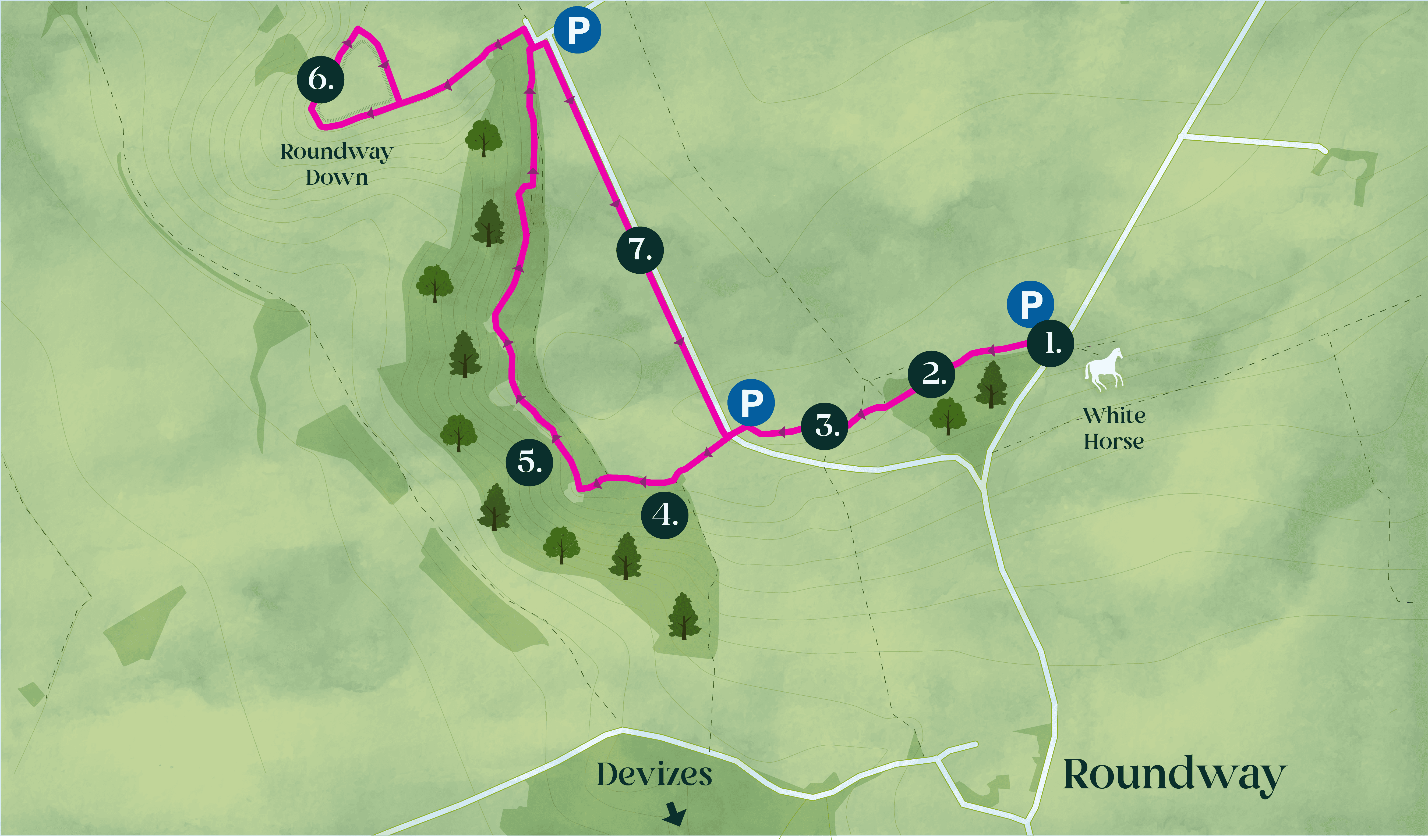 Begin at the car park beside the Devizes White Horse, cut into the chalk hillside above Roundway. The current horse dates from 1999 and is the newest of Wiltshire’s white horses. From here there are immediate views across the surrounding countryside, Roundway village, Bishops Cannings church spire and the town of Devizes. From the car park, head over the wooden style towards Leipzig Plantation.
